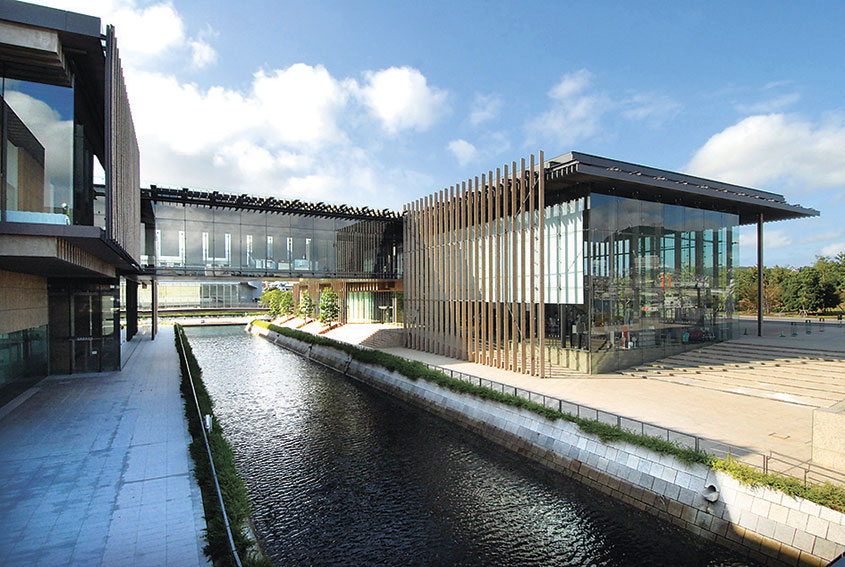 The Nagasaki Prefectural Art Museum is adjacent to Nagasaki Waterfront Park, and has become an extension of the park by incorporating greenery into its buildings — including the museum rooftop, which offers a panoramic view of Nagasaki Port. The buildings, designed by Kengo Kuma and Nihon Sekkei Inc., straddle a canal.