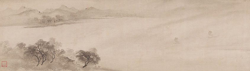 The area around Lake Dongting in Hunan Province (the seat of China’s capital during the Southern Song dynasty) has long been famed for its magnificent scenery, with many artists moved to portray its beauty in works collectively titled “Eight Views of the Xiao and Xiang Rivers” (so named after the two rivers that flow into Lake Dongting). This painting of “Returning Sails off a Distant Shore,” one of the eight views, is attributed to the Southern Song artist and Zen priest Mu Xi. It adeptly uses faint splashes of pale ink to depict sailing boats and their shadows on the lake’s surface. Mu Xi’s works were treasured in Japan, with this masterpiece a cherished early addition to the collection of the Ashikaga shogunal family. It was originally part of a handscroll featuring all eight scenes, but the individual scenes were separated and remounted as eight hanging scrolls, purportedly by the third Ashikaga shogun Yoshimitsu for display in a reception room, with this picture featuring Yoshimitsu’s “Doyu” seal in the bottom left corner. When the Ashikaga shogunate’s reign ended, the warlord Oda Nobunaga rose to power, with Nobunaga also taking possession of this painting.