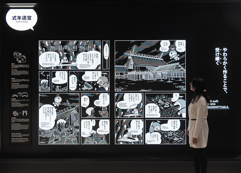 After exploring the potential of algae in the Farm Area, the next exhibit shifts focus from “material” to “object,” introducing sustainable monozukuri (craftsmanship). Guided by Doraemon, visitors learn about creating long-lasting, repairable items and the importance of passing these values on to future generations.