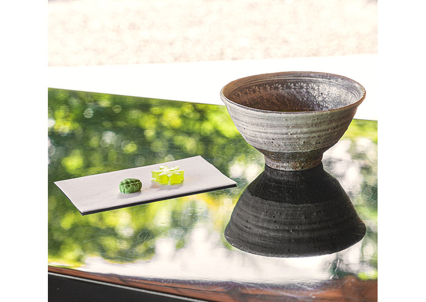 Visitors can enjoy matcha green tea made from 100% certified organic tea leaves and Japanese sweets at tables and chairs while admiring the tea ceremony implements displayed in the grand tea room.