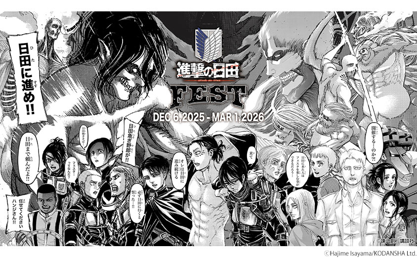 Attack on Titan in HITA FEST Oita Other Date: December 6 - March 1, 2025 Place: Hita city, Oita Fee From ¥3,000 (Partly free of charge) Link https://shingeki-hita.com/event_hita_fest.html