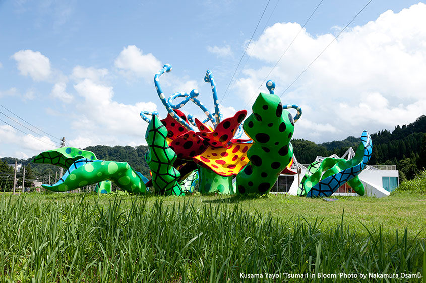 Tsumari is a noble land. It is a land enriched by tolerance that embraces all forms of art. As I watched my huge open-air flower sculpture being installed I felt a deep serenity. Like the flowers, I basked in the air of Echigo-Tsumari and the beatiful sunshine pouring from heavens. I hope that people from all over the world come to see this Triennial and are impressed by finding so much art nestled in its green forests and deep groves. Hurrah for the Echigo-Tsumari Art Triennial! Tsumari in Bloom is my favorite among all of the open-air sculptures that I have created for several places in Japan and other parts of the world.