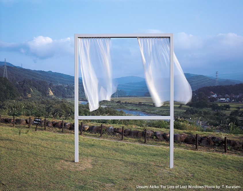 The view seen from a window of a room becomes “my view,” a window ”for rediscovering the” scenery of Echigo-Tsumari spreading outside through the view seen from the window. Its waving curtains reflect the breeze. When she visited Echigo-Tsumari, the artist was overwhelmed by its nature. She resolved to create a work like a flower that would blossom modestly, without disturbing nature. Fluttering curtains brought sunlight and the breeze of satoyama wind to visitors’ hearts.