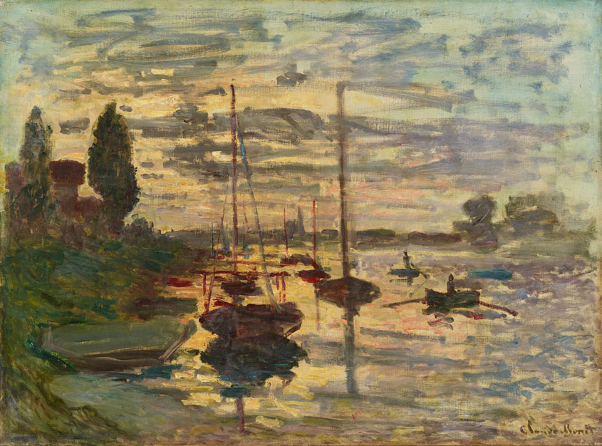 A popular recreational area for residents of Paris, Le Petit-Gennevilliers, on the opposite shore of the Seine from Argenteuil, hosted yacht races every summer. There are several extant works by Monet dating from 1874 depicting the area from a number of perspectives. This painting is one of that group; in it Monet depicts the landscape at sunset, looking towards the lower reaches of the Seine. 1874 was also the year of the first Impressionist exhibition, at which Monet showed Impression, soleil levant the work that gave the Impressionists their name.