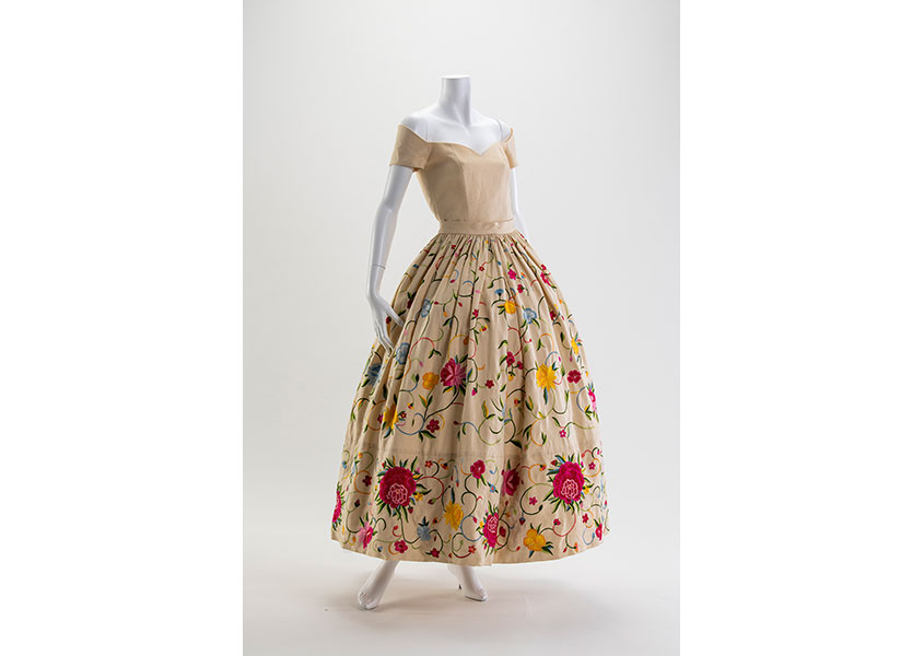 Takada once commented that his florals, used abundantly every season, were different each time in shape and colorway, sometimes two-dimensional, sometimes wallpaper-like, veering from African-inspired to resembling traditional Japanese bed quilts to Kashmiri in mood. This work, created under one of the themes of the 1994 spring-summer "Gipsy" collection, is beautifully embroidered with floral motifs and was inspired by the traditional Manton de Manila Spanish flamenco shawl.