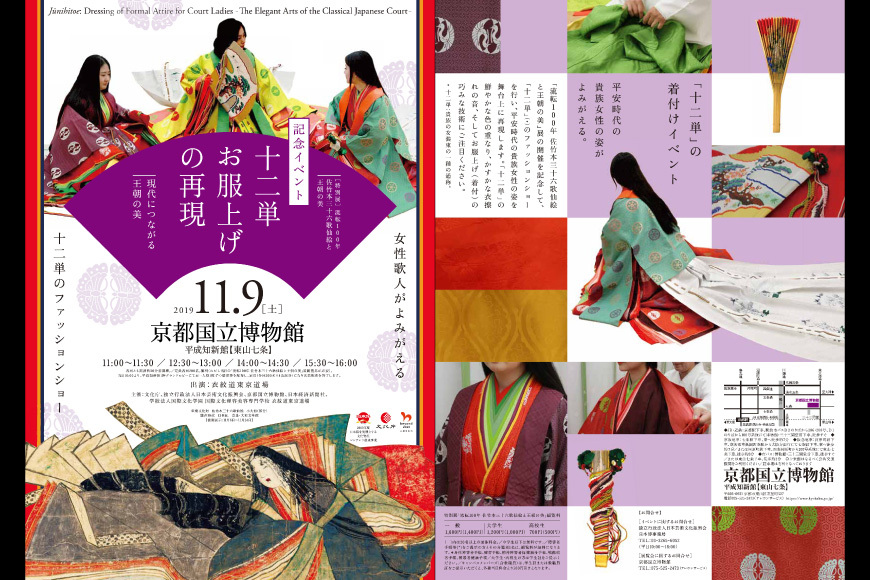 To commemorate the holding of the Special Exhibition “The Thirty-Six Immortal Poets: Elegant Arts of the Classical Japanese Court,” the Kyoto National Museum will hold a fashion show featuring the twelve-layered ceremonial kimono ( junihitoe) worn by court ladies in ancient times. The famed female poets depicted in the scrolls come alive on the runway.