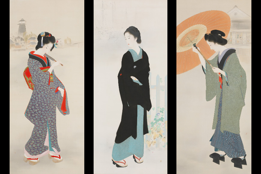 Modern Nihonga painter Kaburaki Kiyokata’s (1878–1972) masterpiece Tsukiji Akashi-cho (Tsukiji Akashi-cho Town; 1927) was missing for 45 years from soon after his death. Kaburaki was known for his depiction of the ways people of the Meiji era (1868–1912) enjoyed the four seasons.