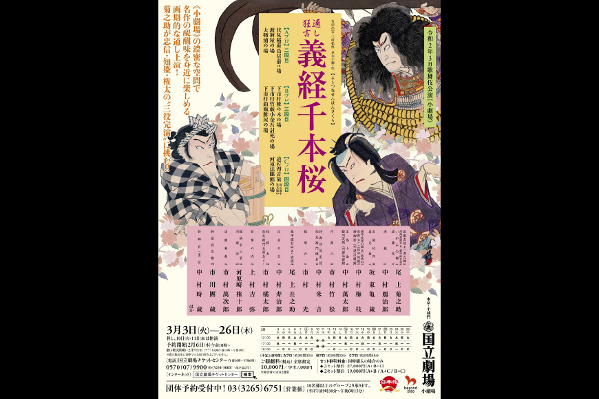 Yoshitsune and the Thousand Cherry Trees was first performed in November 1747 at the Takemoto-za theater in Osaka as a Japanese puppet show, before its adaptation as a Kabuki play the following year. Still popular today, it is considered to be one of the genre's three greatest plays, along with Sugawara and the Secrets of Calligraphy and Chushingura: The Treasury of Loyal Retainers. The story is set in the time of the Genpei War, as chronicled in classic works of Japanese literature such as The Tale of the Heike and Gikeiki, following the fortunes of protagonist Minamoto no Yoshitsune (1159–1189). The work will be performed in three parts, with a stellar cast featuring Onoe Kikunosuke (playing three characters, including the title role), Nakamura Tokizo, and Nakamura Ganjiro. English audio guides will also be available.