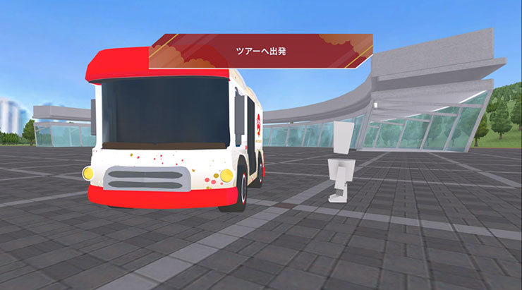 バスツアーの開始は画面右上のアイコンから。いつでもツアーへ出発でき、またツアー中も自由にアバターの操作ができますので、自分のペースでお楽しみください!
