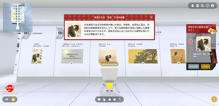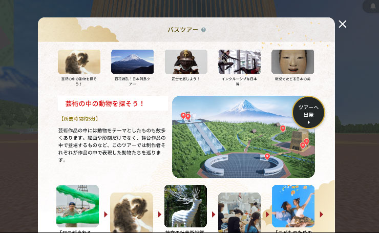 バーチャル日本博内の様々な展示の中から、『武士』『動物』などのテーマに沿ったコンテンツを順番に巡ることができます。