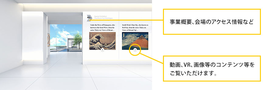 オンライン上で、実際に行われる日本博事業とのつながりを持たせつつ、1万年前の縄文時代の文化財から、仏像などの彫刻、浮世絵、工芸、きもの、ファッション、現代アート、マンガ・アニメなどの展覧会、歌舞伎、能楽、文楽などの伝統芸能、現代舞台芸術、芸術祭、アイヌ文化を活用した各種体験事業などのコンテンツを日本語と英語で掲載し、国内外からアクセス可能な体験型のバーチャル空間を構築していきます。